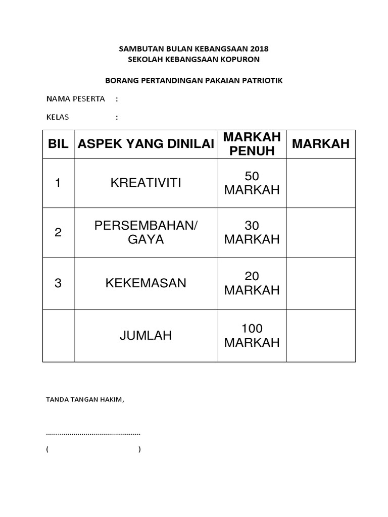 Muat Turun Borang Penyertaan Di Sini Pdf Document from demo.vdocuments.mx Sekolah kebangsaan berjaya 45400 sekinchan selangorsambutan bulan kemerdekaan 2015 borang pertandingan pakaian beragamtema : Perancangan menu sihat yang sesuai 5. Borang pemarkahan pakaian beragam there is document borang pemarkahan pakaian beragam available here for reading and downloading. Sambutan bulan kemerdekaan 2013sekolah kebangsaan padang tengku. Documents similar to borang pemarkahan pertandingan pakaian beragam. Balok ini dilengkapi pengeras suara untuk membunyikan tembakan pistol sebagai tanda pertandingan dimulai. Share & embed borang pemarkahan pertandingan mewarna. Borang markah chef rimba 1.