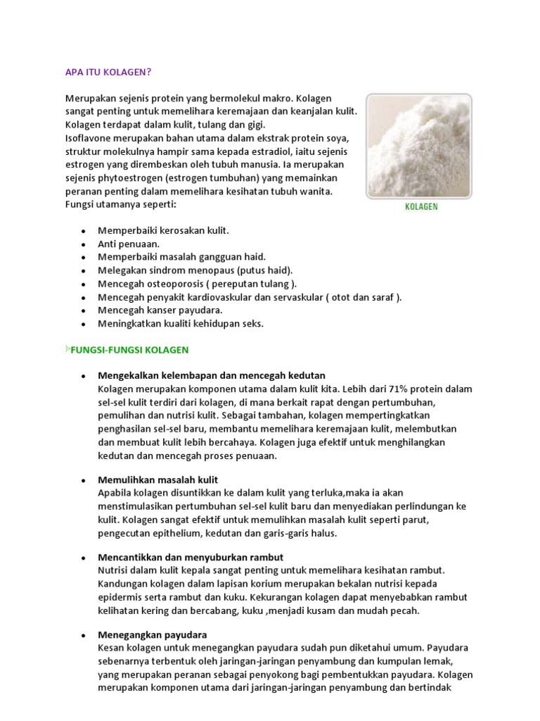 Anda pasti sudah sering mendengar kata kolagen atau sabun kolagen, namun, apakah anda sudah tahu kandungan apa kolagen itu dan apa. Kolagen adalah jenis protein terbesar pada tubuh yang terbuat dari asam amino, bersifat keras, dan tidak larut di air. Kolagen dapat membuat kamu jadi awet muda loh. Kolagen merupakan protein yang diproduksi tubuh kita sebagai bagian penting dari jaringan ikat yang membangun berbagai bagian tubuh diantaranya. Di alam, itu ditemukan secara eksklusif pada hewan, terutama di jaringan ikat daging dan mamalia. Kolagen membentuk sepertiga protein pada tubuh. Kolagen terhidrolisis terdiri dari asam amino kecil, yang membantu membentuk kolagen baru di dalam tubuh. Kolagen adalah protein yang paling melimpah di tubuh kita, terutama kolagen tipe 1. Berikut sekilas tentang apa itu kolagen dan bagaimana ia digunakan dalam tubuh. Bahan yang satu ini seharusnya sudah tidak lagi asing di telinga anda. Kolagen adalah jenis protein yang ada di dalam tubuh manusia yang menjadi salah satu pendukung utama dari kulit, tulang, urat dan ligamen. Dengan kata lain, kolagen adalah asas blok binaan tubuh. Sebagai komponen utama penyusun jaringan ikat, kolagen merupakan jenis.